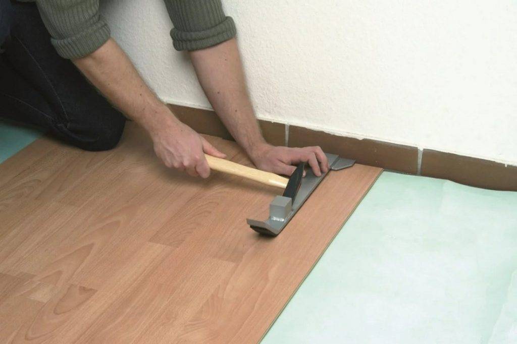 При подбивке панелей между собой для устранения щелей используется добивочный брусок (об этом чуть ниже) и по нему бьют ударным инструментом. Киянку для таких целей применять сложно – она по размерам головы заметно крупнее молотка. При подстукивании может цеплять подложку, так как угол, под которым заходит ламинат бывает разный.