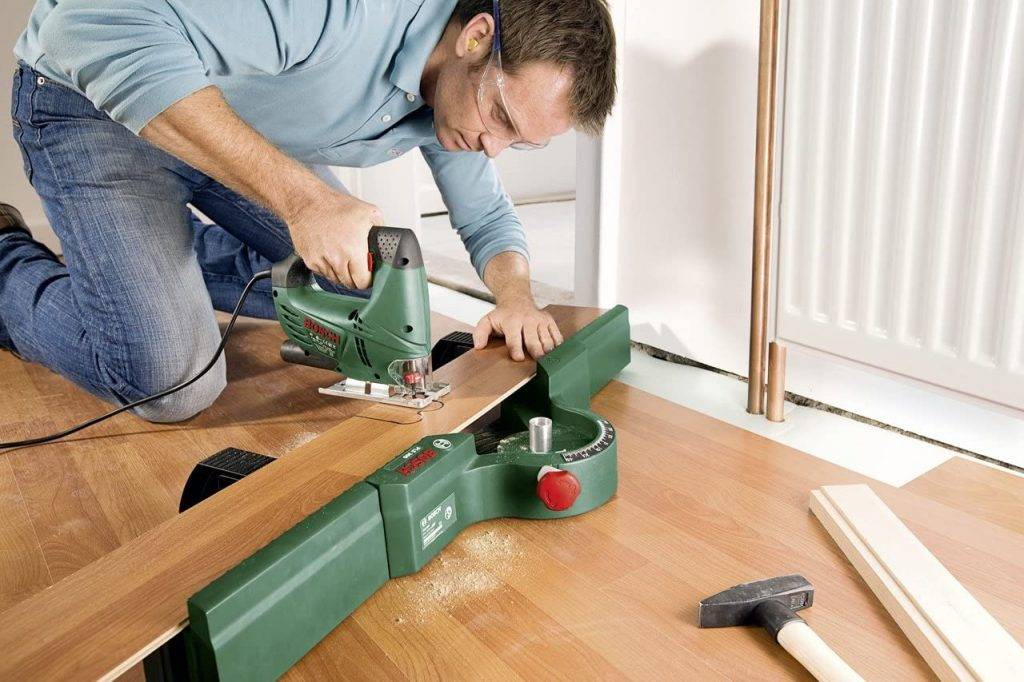 Для корректного использования электролобзика необходимо на тыльной стороне элемента пола начертить прямую линию в соответствии с разметкой, положить доску на табурет или иное возвышение так, чтобы место среза свободно нависало над полом. Далее нужно зафиксировать материал струбциной или просто прижать коленом к рабочей поверхности и произвести чёткий распил.