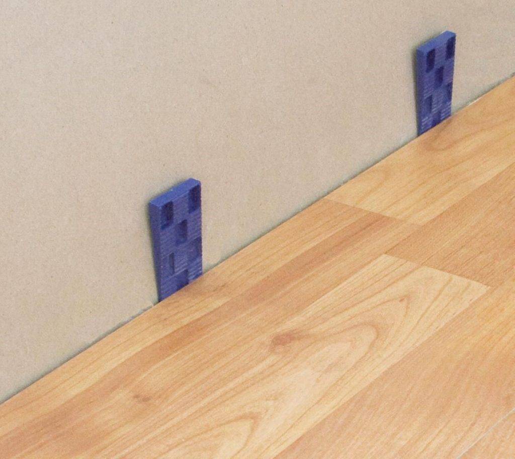 Для того, чтобы достигнуть этого эффекта, мастер, как правило, устраивает зазор в 5 – 7 мм от стены до ближайшей кромки ламината. Однако в процессе воздействия киянкой этот зазор может нарушиться, и на помощь приходят специальные распорные клинья из пластика или дерева. Материал аккуратно забивается в щель и помогает обеспечить незначительное смещение всех элементов, собранных воедино.