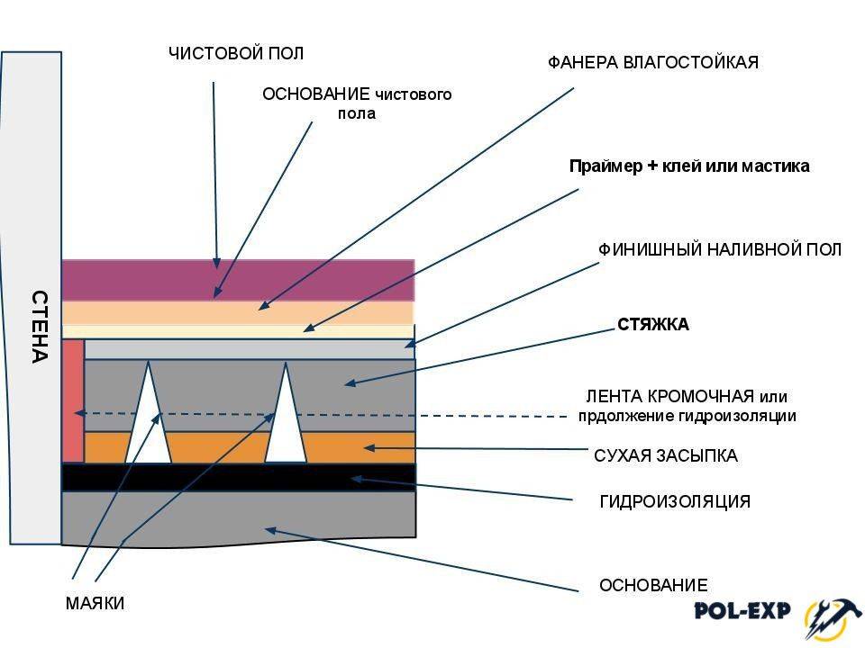 Бетонная стяжка может быть помещена на основание, когда старое покрытие демонтировано и проведен ремонт, или сверху гидроизоляции. Чтобы все было ровно следует сформировать нулевой уровень, используя маяки. От основания он поднимается на 1.5 см.
