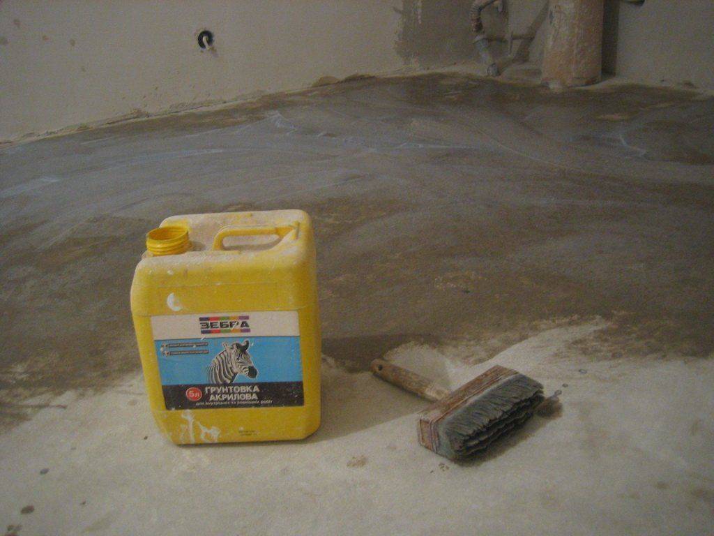 Шестой этап – прохождение по полу широкой кистью с грунтовкой. Также удобно наносить грунтовый раствор валиком или шпателем. Даем высохнуть материалу в течение 5-6 часов.