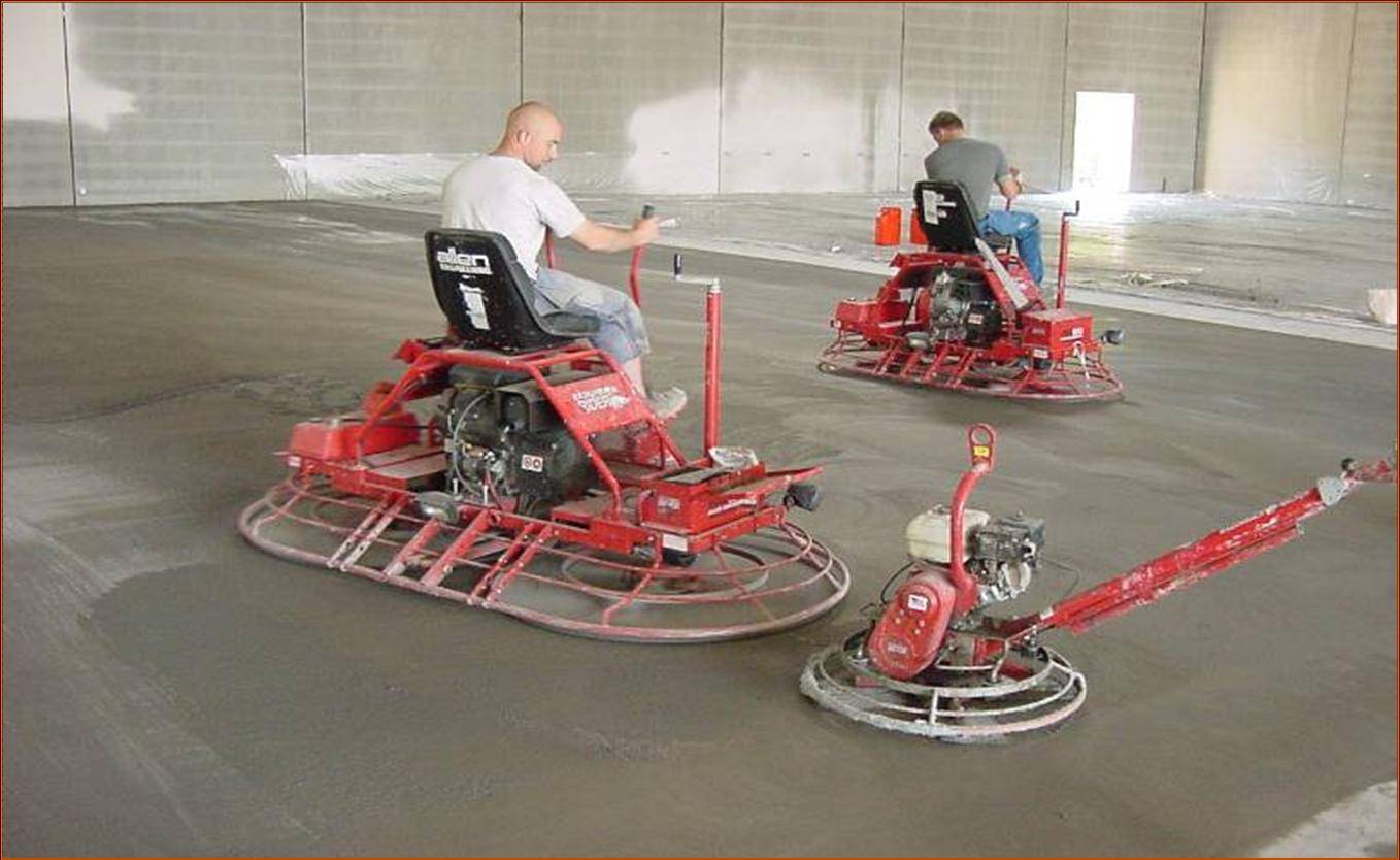 Даже в небольших помещениях для затирки желательно использовать механические средства. Для этого выпускают затирочные машины разных типов и размеров. Принцип их работы прост: двигатель вращает диски или лопасти, которые «втирают» уплотнитель в верхние слои бетона. Из-за сходства с летательным аппаратом их часто называют «вертолетами».
