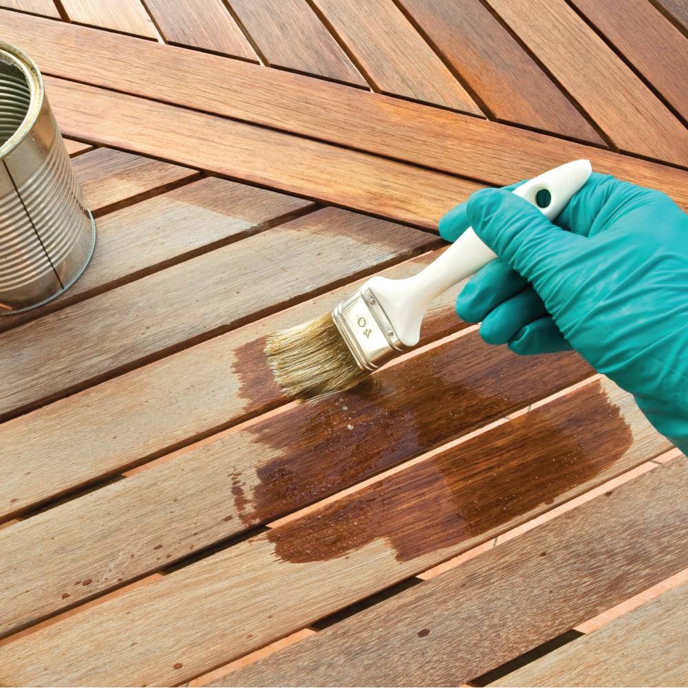 Разобранные элементы покрывать гораздо проще, чем готовый пол. Доски лучше пропитывать на солнце, под воздействием ультрафиолета влага быстрее испаряется из глубинных слоев. Бетон во вторичной обработке не нуждается, а дерево после длительной эксплуатации обновляют: снимают шлифмашинкой верхний слой древесины, затем проводят обработку отбеливателями и пропитками.