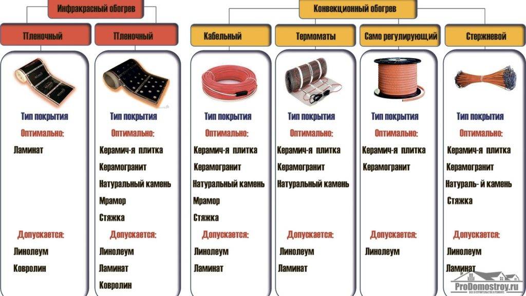 Сегодня существует несколько видов теплых полов, каждый из которых имеет свои плюсы и минусы. Целесообразность установки каждого вида в качестве основного отопления зависит от параметров помещения и планируемого источника тепла.