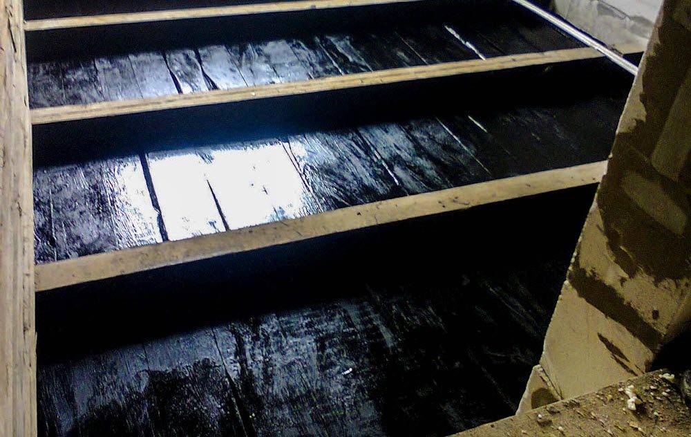 Обмазка битумной мастикой стяжки или лаг перед настилом деревянного пола.