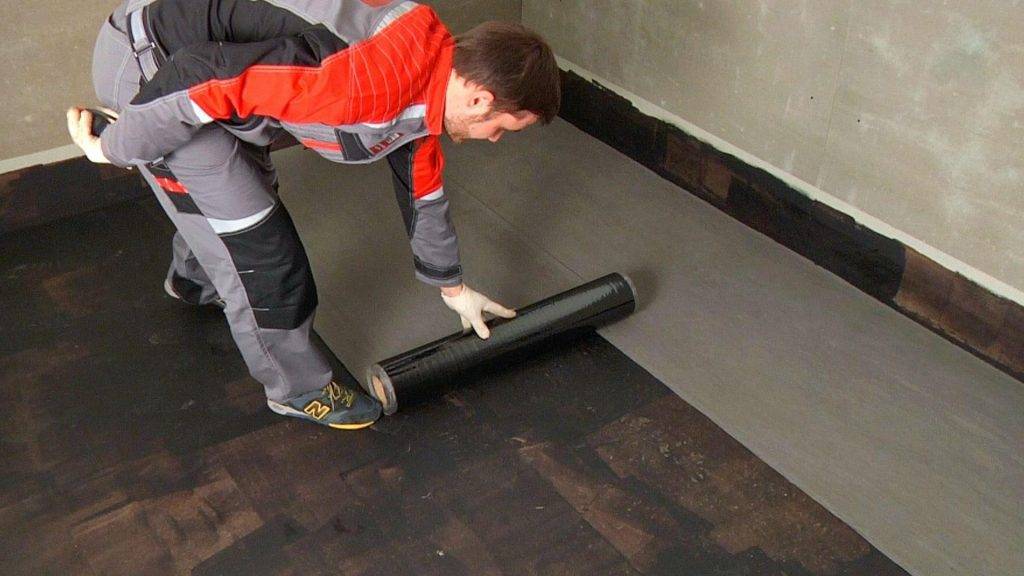 - С пола убирается весь мусор и наносится слой гидроизоляции, это могут быть специальные материалы, обычная пленка или гидрофобные мастики.