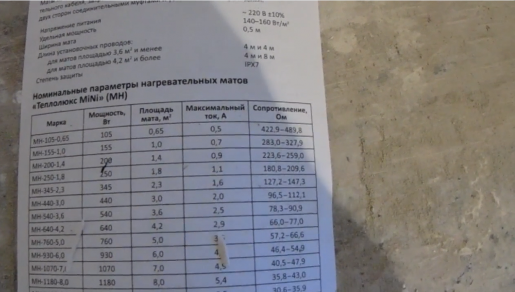 В инструкции по эксплуатации определяются технические характеристики теплого пола в зависимости от его марки. Из таблички можно найти потребляемую мощность, площадь мата, максимальную силу тока и интервал, в котором должно находиться сопротивление нагревательного элемента;