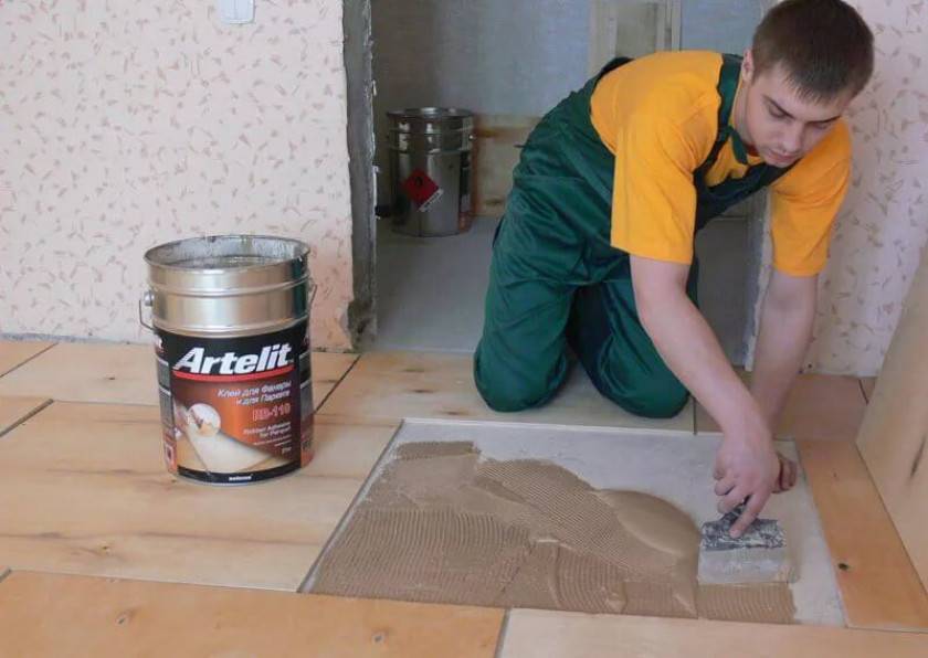 - Нанесите клей для фанеры на деревянный пол. Толщина слоя должна быть 2-3 мм;