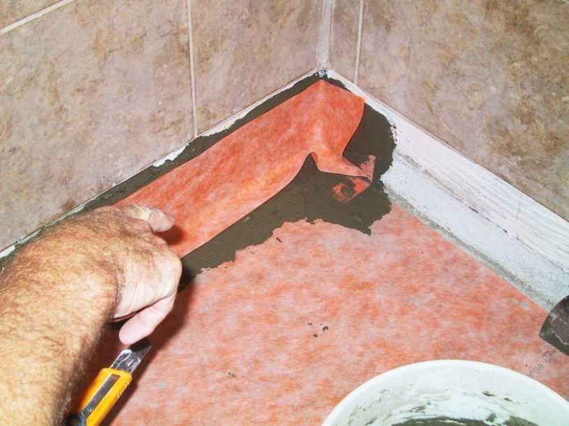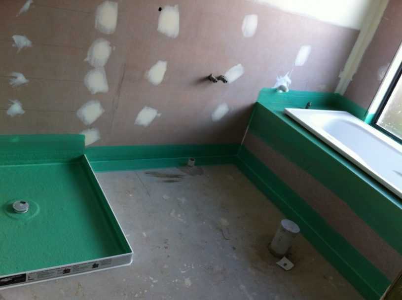 Материал прокатывают валиком, чтоб он как следует пристал к основанию. Также в ванной можно применять самоклеющиеся гидроизоляционные мембраны. Перед укладкой с нижней стороны удаляется защитная пленка, дополнительное проклеивание мастикой нужно только в местах нахлестов.