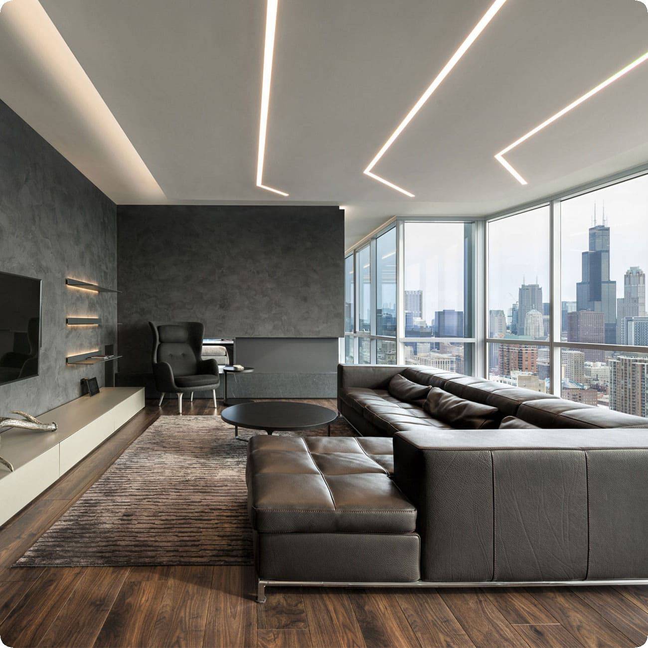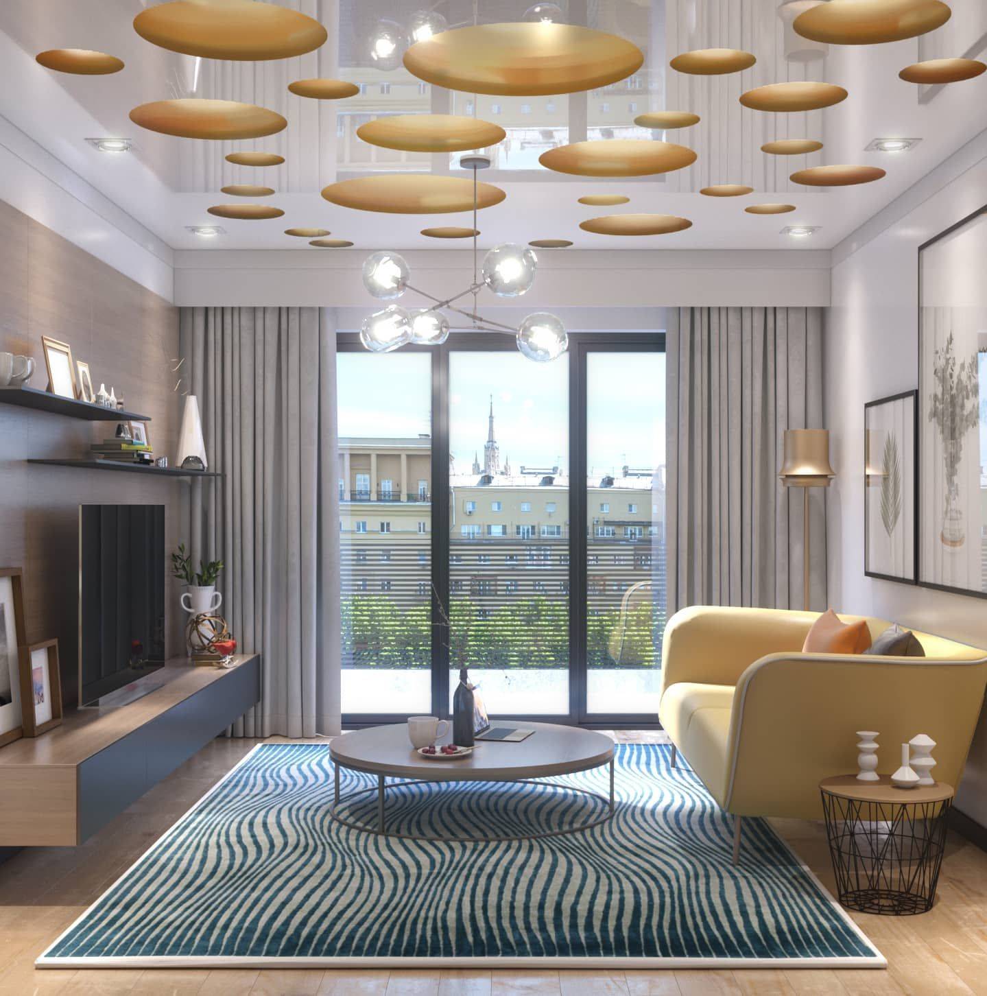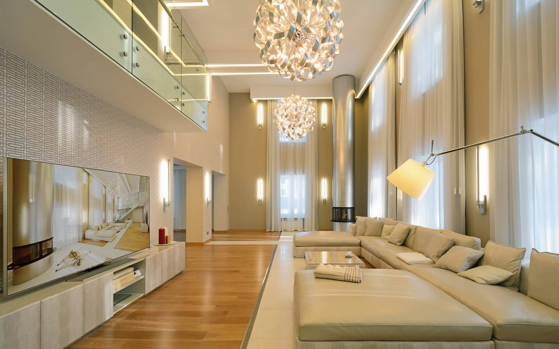 Акцент на высокий потолок. Этот тренд подойдет для просторных гостиных с высокими стенами