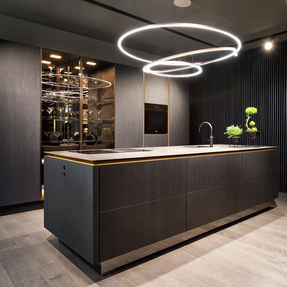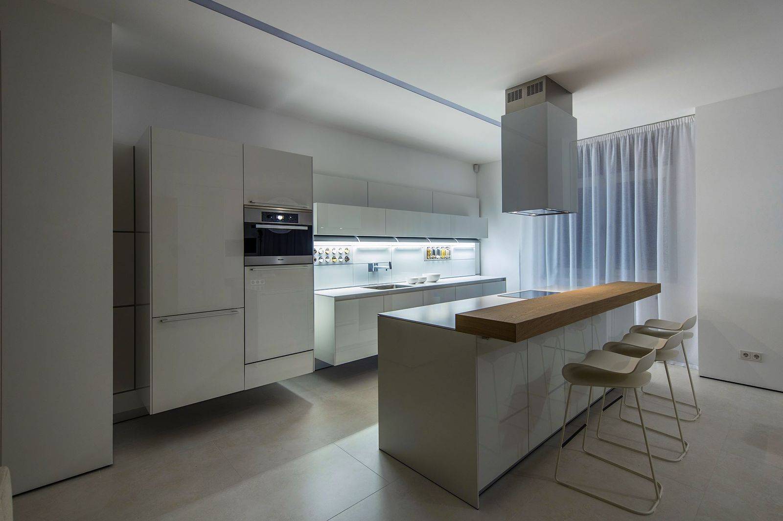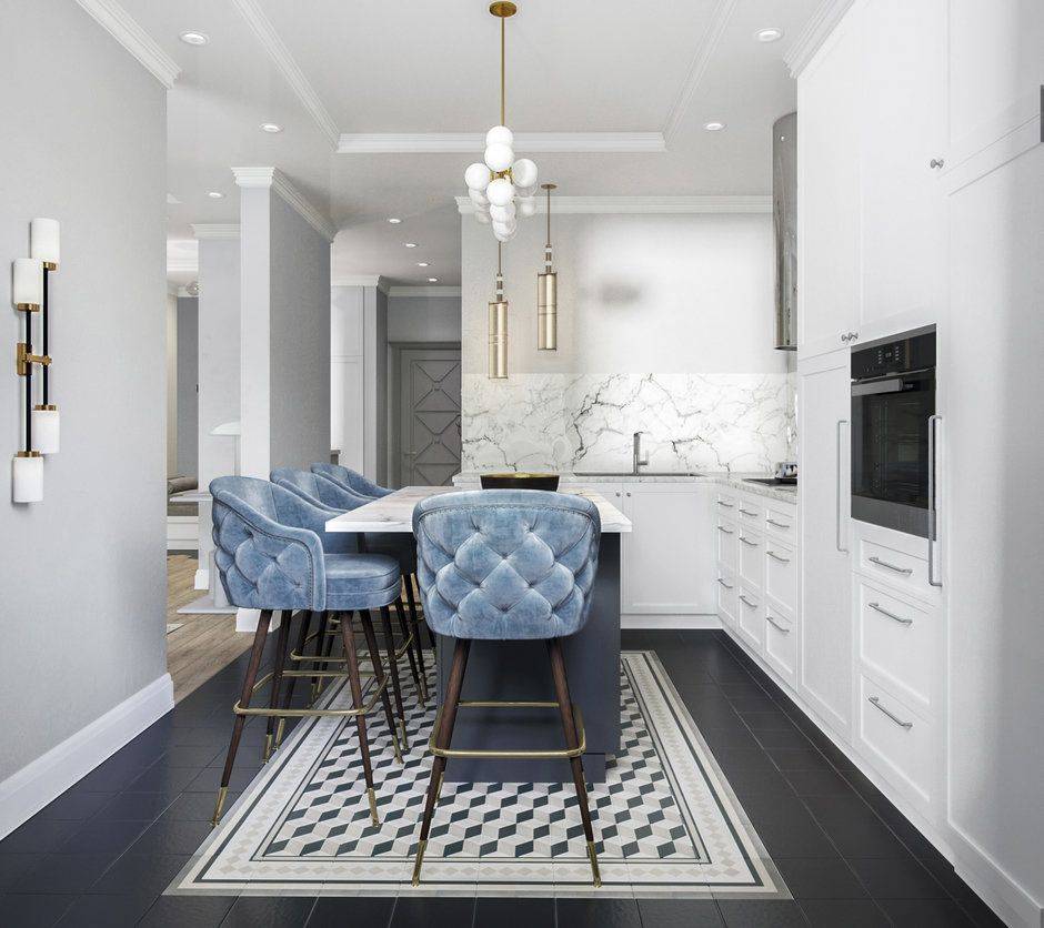 - Установка острова с подсветкой и мраморной столешницей. Не ушла из моды и барная стойка.