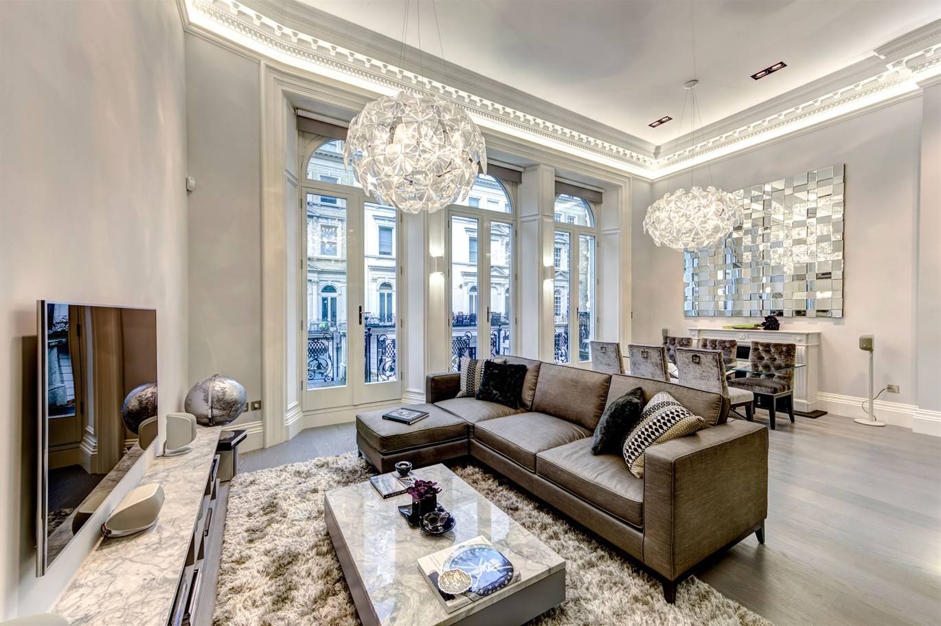 Неоклассика. Альтернативой стилю хай-тек выступает неоклассицизм, отражающий высокий социальный статус своих хозяев. В сезоне 2019-2020 будут популярны обои с металлическим блеском, флористическим рисунком и мебельные ткани с необычной фактурой. Отличным решением станет пол-мозаика из натурального камня с орнаментом в виде ковра. Шик интерьеру придадут хрустальные люстры со струящимися подвесками.