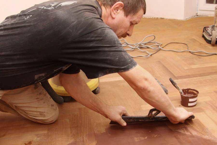 Как убрать скрип паркета, если на нем есть только небольшие трещины и выбоины? Очень просто — прошпаклюете поверхность специальной шпатлевкой для паркета или дерева. Она заполнит все щели и ламели не будут больше тереться друг об друга. Еще один вариант заполнения трещин — казеиновый клей смешанный с опилками. Его заливают во все проблемные места, а после высыхания хорошенько шпаклюют и покрывают поверхность защитным лаком. Если щели между панелями более 4-5 мм, то заливать клей бесполезно — он все равно рассохнется. В этом случае вам придется удалять ламель и вставлять на ее место более широкую.