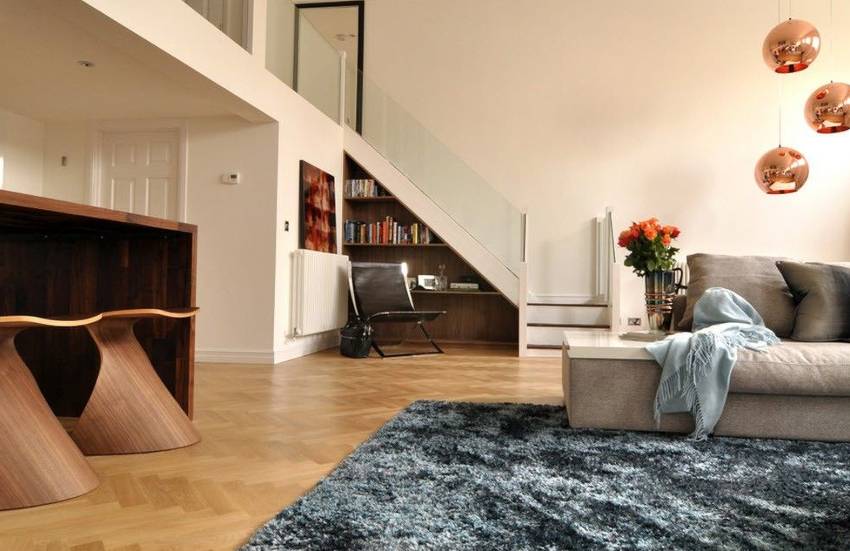 Далее целесообразно так обустроить нишу, чтобы она сочеталась с помещением, в котором эта лестница возведена. А это может быть и прихожая, и кухня, и гостиная.