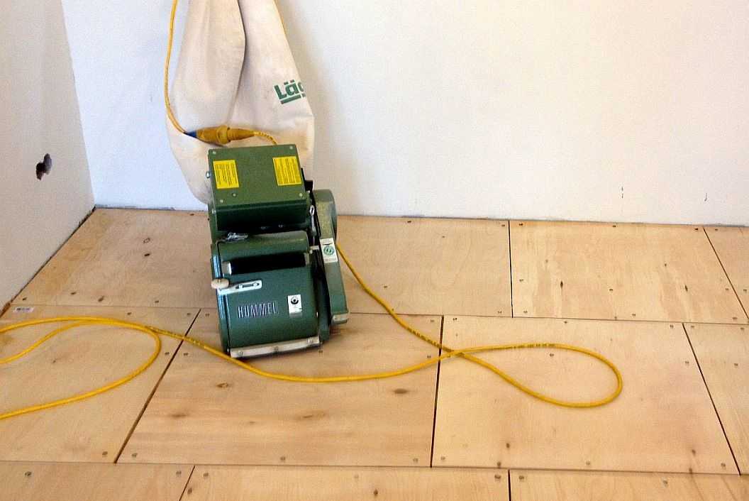 После укладки фанеры выжидают 2-3 дня. Клей высохнет, фанера примет «рабочие размеры». Теперь ее шлифуют, добиваясь отсутствия перепадов высоты, которые образуются из-за того, что листы немного отличаются по толщине. Укладка на клей также может добавить разницу.