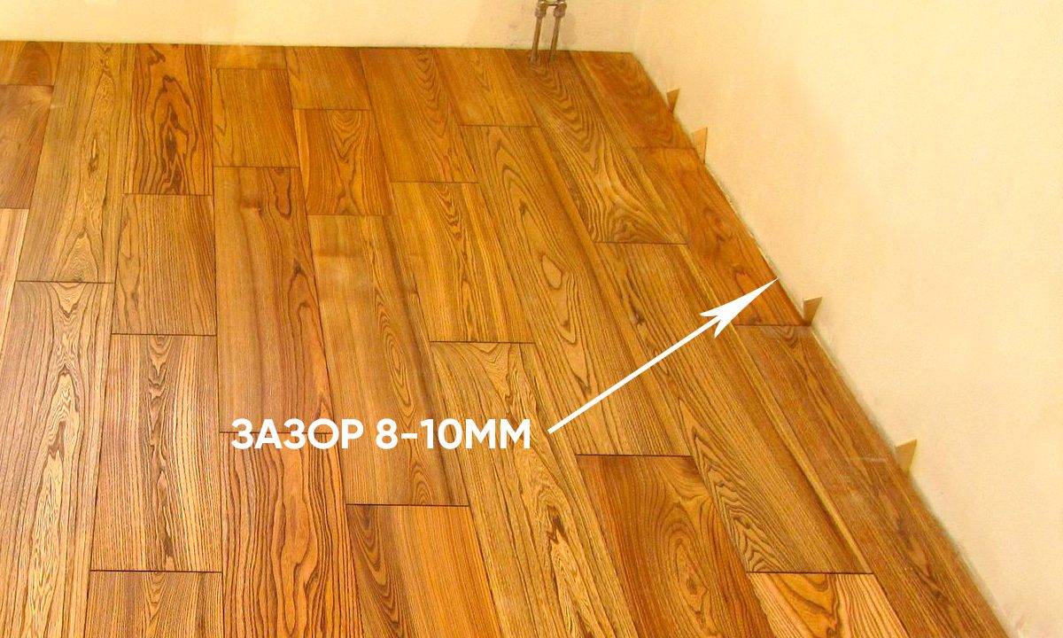 Паркетная доска укладывается с отступом от стен 8-10 мм, независимо от способа монтажа. Это расстояние нужно для компенсации температурных расширений. После монтажа эти швы будут скрыты плинтусами.