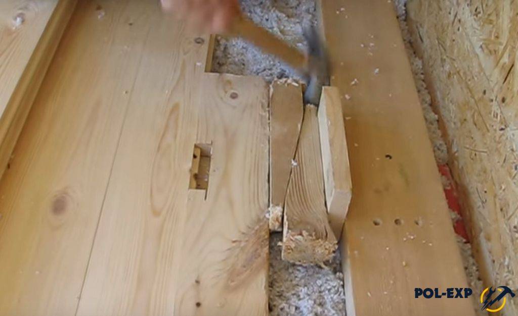 К устанавливаемой доске прикладывают кусок «для подбоя» с окошком, через которое можно будет закрутить саморез. Для того чтобы можно было стягивать половицы, между опорой и клиньями вставляют обрезки. Сначала нужны длинные куски, затем все меньше. Вся конструкция собирается так, чтобы клинья встали таким образом, чтобы подбив их, можно было сплотить доски.