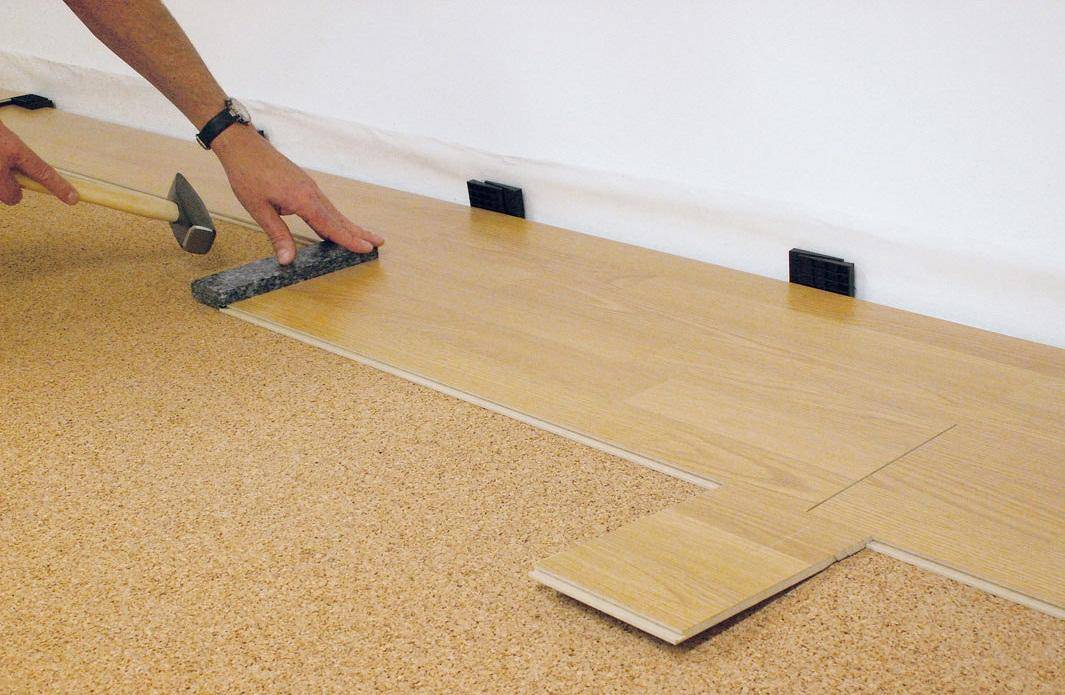 Технология укладки предполагает необходимость крепления ламината посредством замков, если необходимо используют молоток с целью уплотнения изделий.
