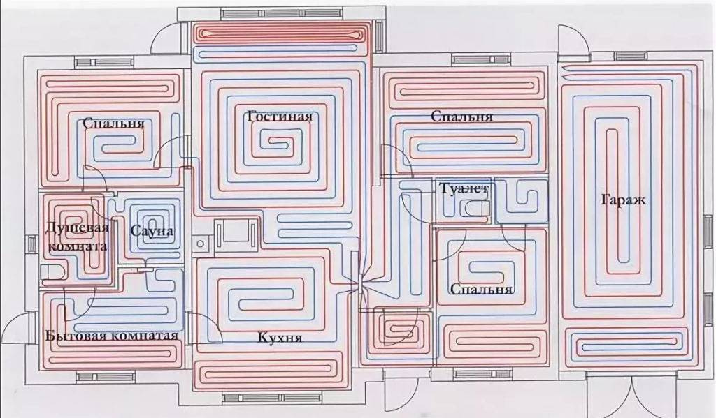 Для этого следует спроектировать укладку контуров теплого пола зонировано. Т.е. труба контура водяного пола должна быть проложена только в одной комнате. Если площадь комнаты больше, чем 12 кв. м. следует уложить два или три контура трубы.