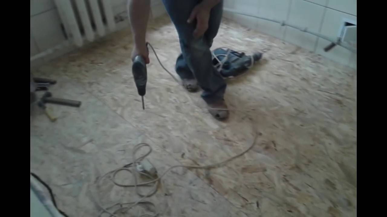 Их крепим к лагам при помощи шуруповёрта, загоняя головки саморезов в древесину.Когда перекрытие на лагах готово, под укладку ламината можно ещё положить специальный амортизирующий материал. Это позволит смягчить нагрузку на ламинат/паркет. Линолеум и ковроллин можно устраивать непосредственно на древесные плиты.