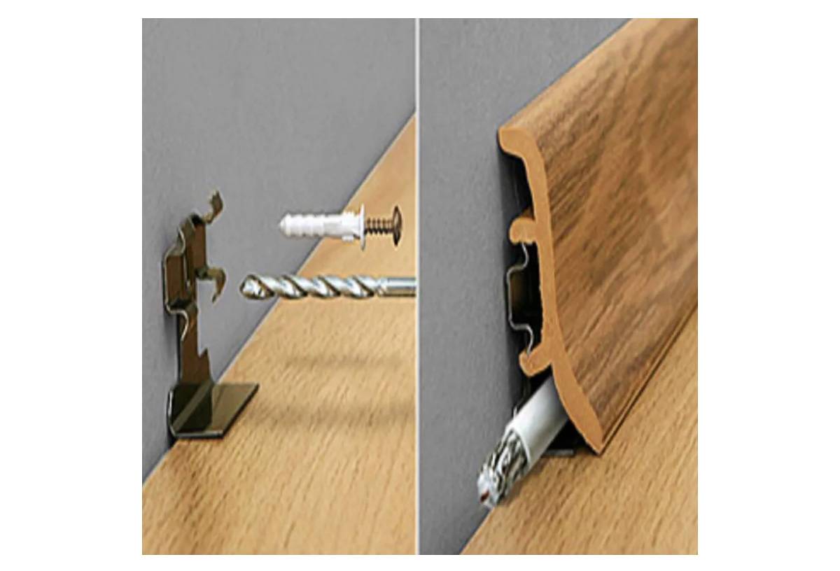 Этот способ монтажа плинтусов, у которых есть кабель-канал или задача скрыть точки креплений. Условие его успешной реализации – исходная ровность стен, незначительные отклонения по уровню шага крепления кляймеров уменьшаются с рекомендуемых 40 см до 20, при серьезной кривизне сокращение интервалов становится бессмысленным.