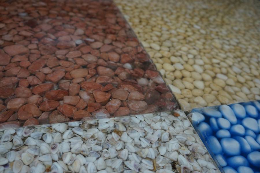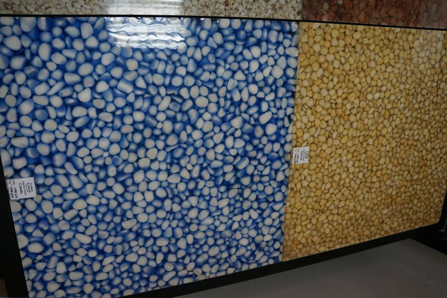 Галечные камни в застывшей эпоксидной смоле. Цена у изделия близка к заоблачной – в среднем порядка 25 – 30 000 рублей за квадратный метр. Размеры плитки тоже внушительные: 1220 мм на 2440 мм. Найти товар в магазинах проблематично. Да и оформить под заказ эпоксидную диковинку можно лишь на нескольких торговых интернет-площадках.