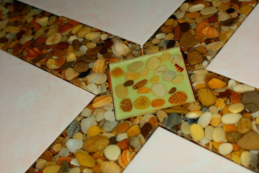 Для облицовки напольного покрытия используют природную гальку – ее можно приобрести как в торговой точке насыпью, так и собрать самостоятельно на пляжах. Данный вариант требует значительных временных затрат и усердной работы. Помимо процесса укладки, предстоит разобрать гальку по форме, размерам и оттенкам.