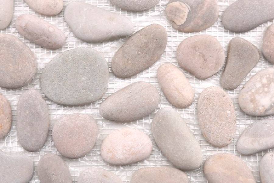 Самый простой способ создания галечных полов связан с использованием специальной плитки. Она представляет собой квадратики сетки (чаще всего — 30х30см) с наклеенной галькой. На каждой плитке помещается около 60 камешков. Благодаря тому, что ее основа – прозрачная сетка, а расположение камней – волнообразное, стыки между плитками получаются практически незаметными. В результате укладки такой плитки образуется сплошное мозаичное полотно без видимых швов. Это значительно облегчает работу мастера-самоучки, решившего самостоятельно сделать пол из гальки.