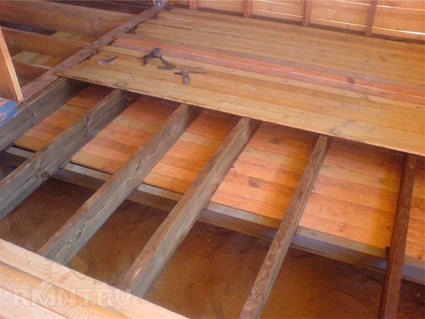 - Укладка лаг и финишного настила. Для обустройства протекающих полов лаги кладутся в произвольном порядке с соблюдением горизонтальности. При монтаже непротекающего основания делаем уклон из лаг в сторону приямка. В случае с непротекающими полами к лагам прибивают черепные брусочки, на которые бросают черновые доски. Затем на них кладут слой гидро- и теплоизолятора. После этого деревянная обрешетка обшивается шпунтованной доской. Внутри «пирога», между чистовыми досками и лагами, должен оставаться зазор в 10-12 см для вентиляции подполья.