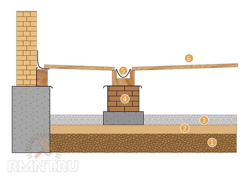 Сплошной непротекающий пол обязательно укладывается с уклоном. Желоб можно расположить в одной из лаг, расположенных близко к стене. 1. Грунт. 2. Песчаная подушка. 3. Керамзит или другой насыпной теплоизоляционный материал. 4. Кирпичный столбик на бетонной основе. 5. Желоб. 6. Половая доска