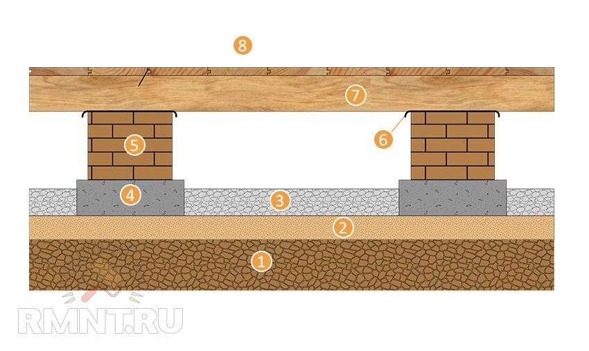Сплошной непротекающий пол поверх грунта. 1. Грунт. 2. Песчаная подушка. 3. Керамзит или другой насыпной теплоизоляционный материал. 4. Фундамент опорного столба. 5. Кирпичный столбик. 6. Гидроизоляция. 7. Лаги. 8. Половая доска