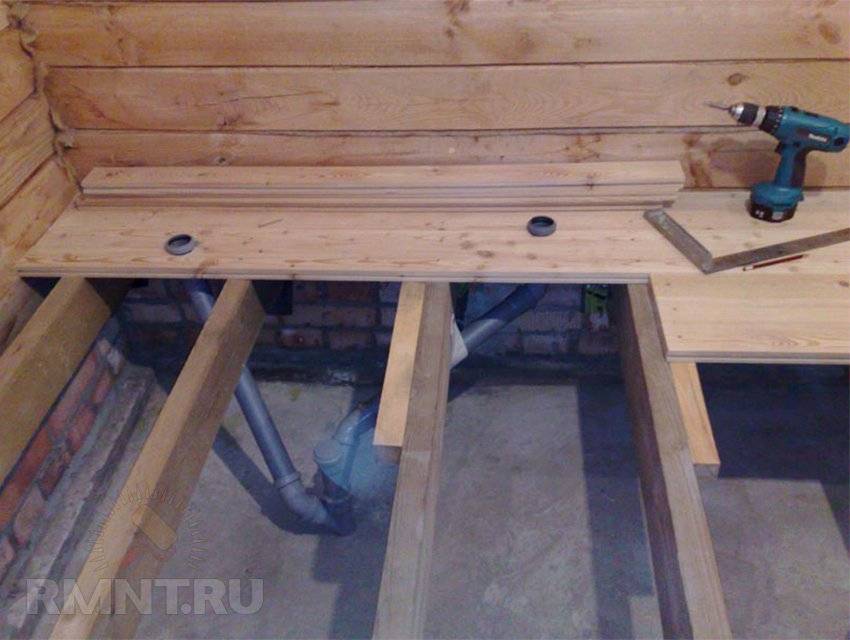 Кстати, старайтесь сделать так, чтобы расстояние между грунтом и нижней стороной балок, было не менее 30 сантиметров. Здесь обязательно нужен вентиляционный зазор, чтобы полы снизу проветривались. Переходим к следующему этапу… Монтаж деревянного пола ведём элементарно: берём строганную обрезную доску толщиной 30 мм, пилим в размер (по 2-3 см. не доводим до стены) и укладываем на балки, предварительно обработав защитой от влаги. Доски в нескольких местах можно прикрутить саморезами. Между досками оставляем щели в 5 мм. Через них и будет уходить вода. Поэтому протекающие полы так и называются, вода протекает сквозь них.