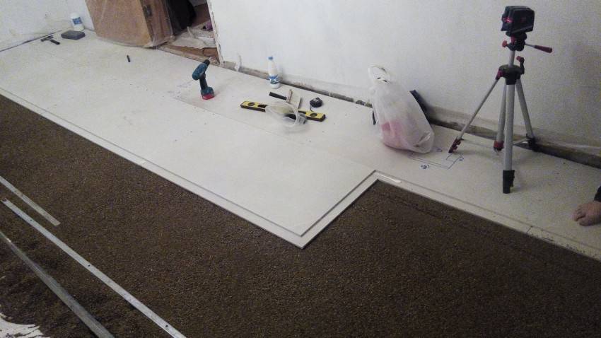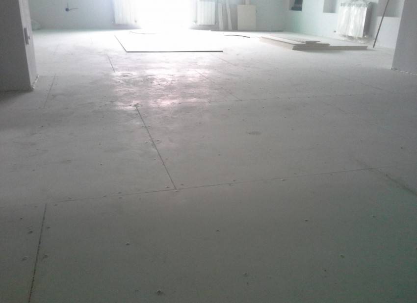 Важный момент, во время укладки листов между ними должно оставаться небольшое расстояние, 5-9 мм. От влажности они могут со временем расшириться, и без отсутствия зазора покрытие деформируется. Фиксируется такое покрытие саморезами, после покрывается грунтовкой, для лучшего сцепления с цементной смесью.