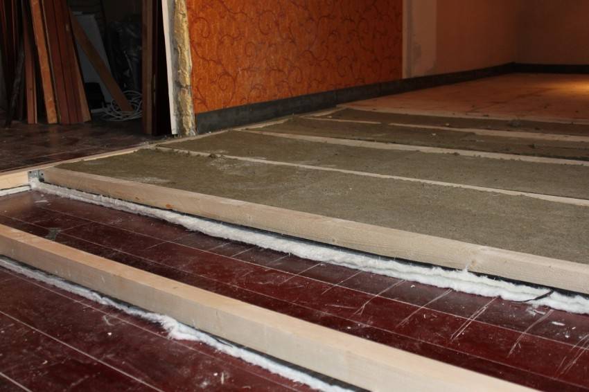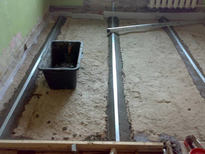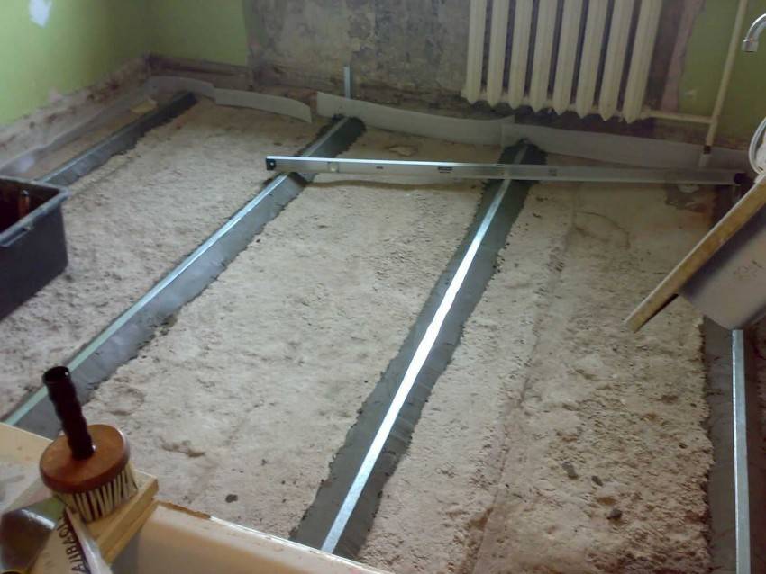 Но в том случае, если это невозможно – придется заливать по частям, между которыми необходимо устраивать деформационные швы. Если поверхность неровная или нужно красиво оформить переходы в районе порога, то потребуется установить маяки для наливного пола, которые нужно подготовить заранее, например, используя цементно-песочный раствор.