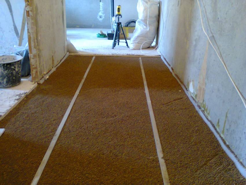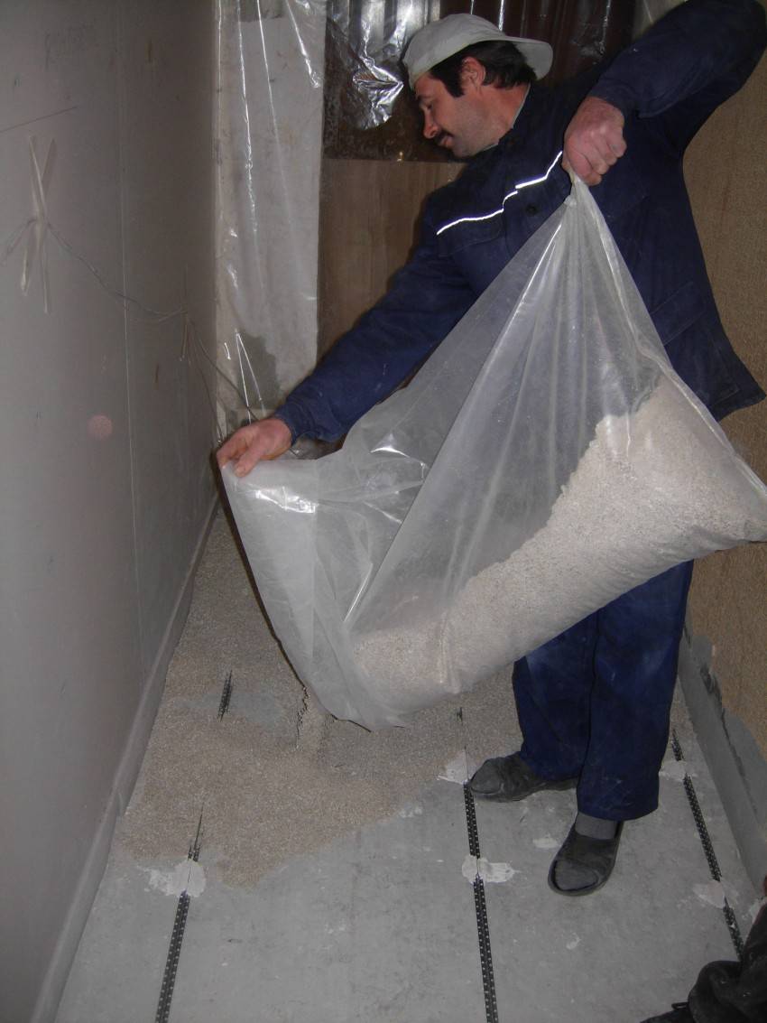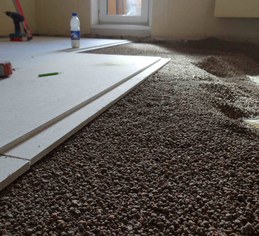 Выравнивающий слой засыпки становится дополнительным утеплением пола, придаёт ему довольно высокий шумопоглощающие способности.