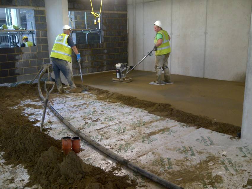 - Заливка бетоном и выравнивание поверхности. Качество выравнивания зависит от дальнейшего использования бетонной поверхности. Если она служит основанием для укладки финишных покрытий, то к плоскостям не предъявляются высокие требования, все неровности в дальнейшем устранятся цементно-песчаной стяжкой. Если бетон будет служить основным полом, то разбежность по углам помещения не должна превышать ± 1 см. Такие же жесткие требования к качеству бетонной стяжки предъявляются и при монтаже теплых полов.