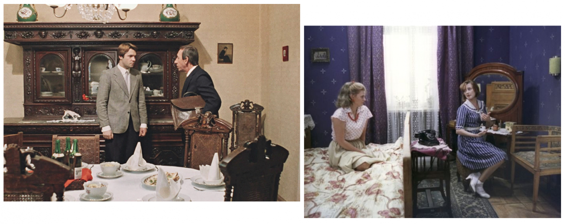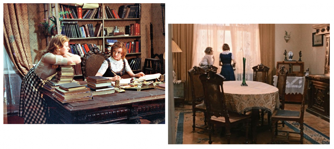 Что такое роскошь по-советски иллюстрирует оскароносная картина Меньшова «Москва слезам не верит». Речь о шикарной квартире профессора Тихомирова, в которой временно живут главные героини. На фоне аскетичной обстановки эпохи дефицита, профессорская квартира демонстрирует добротный интерьер, проникнутый духом довоенной русской усадьбы.