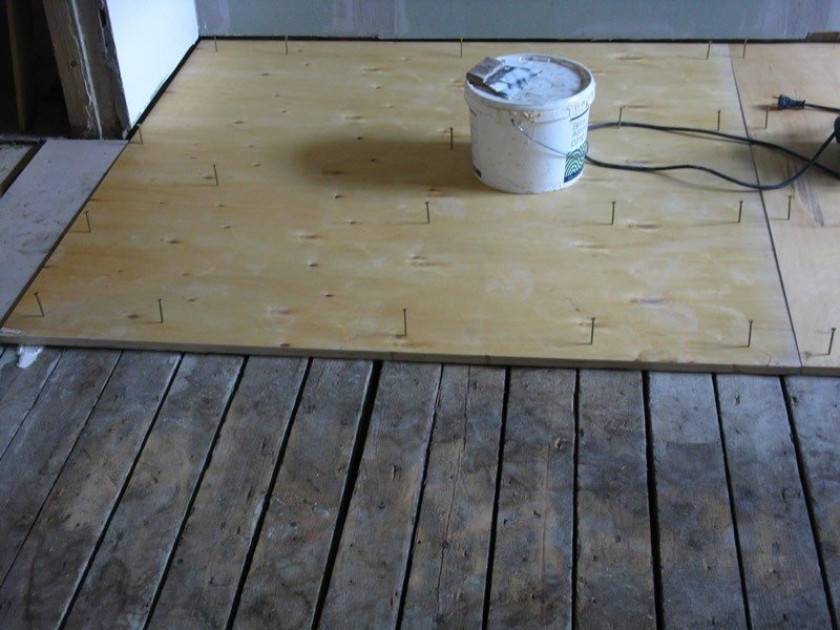Прежде чем приступать к монтажу напольного материала, требуется подготовить основание. Пол из дерева очень часто имеет такие недостатки, как скрип досок, зазоры или неровная поверхность. Если их не устранить, то после укладки материал может порваться через какое-то время. Самым простым способом избавиться от имеющихся дефектов является укладка на пол листов фанеры или ОСП.