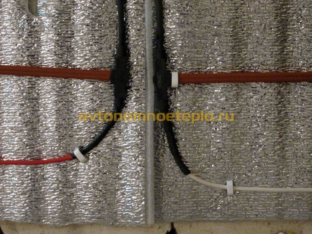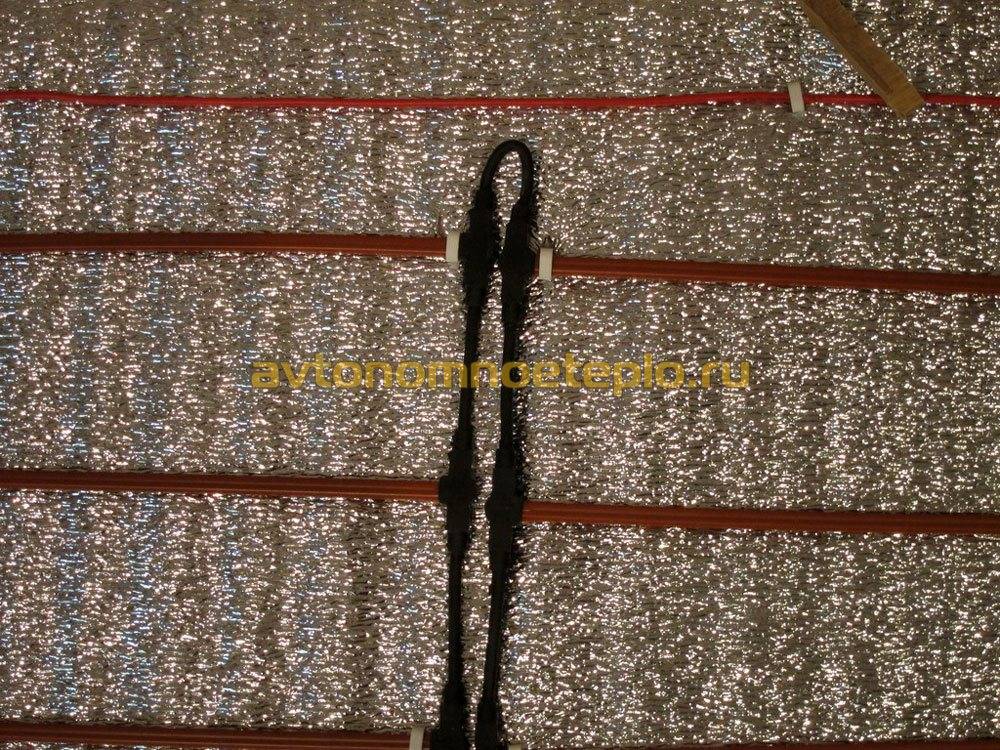 - Нагревательные элементы укладываются поверх утеплителя. Эти элементы могут представлять из себя водяную трубу, нагревательные маты, кабеля и всё то, что вы найдёте на рынке отопительных технологий.