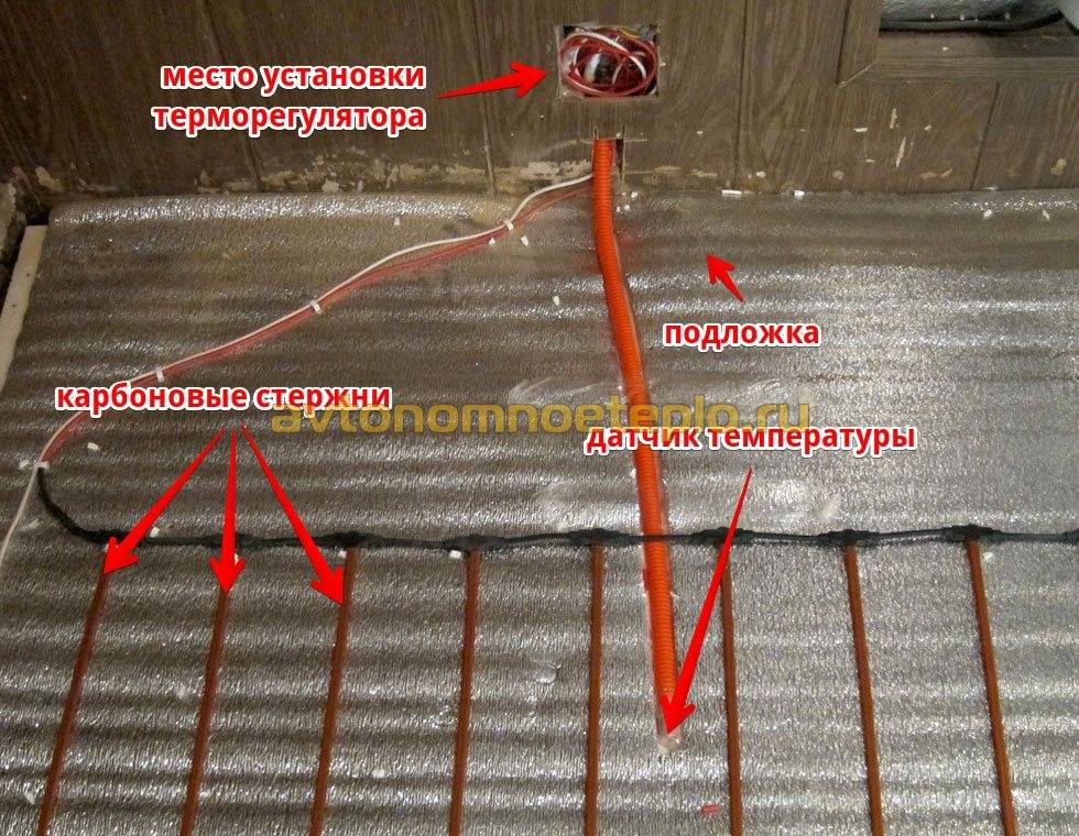 Упрощенная схема подключения стержневого теплого пола выглядит так: «электросеть – нагревательные стержни – терморегулятор».