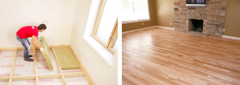 - Поверх сухой засыпки укладываются панельные элементы пола. Обычно используются двухслойные гипсоволоконные плиты , имеющие по краям шип паз для соединения.