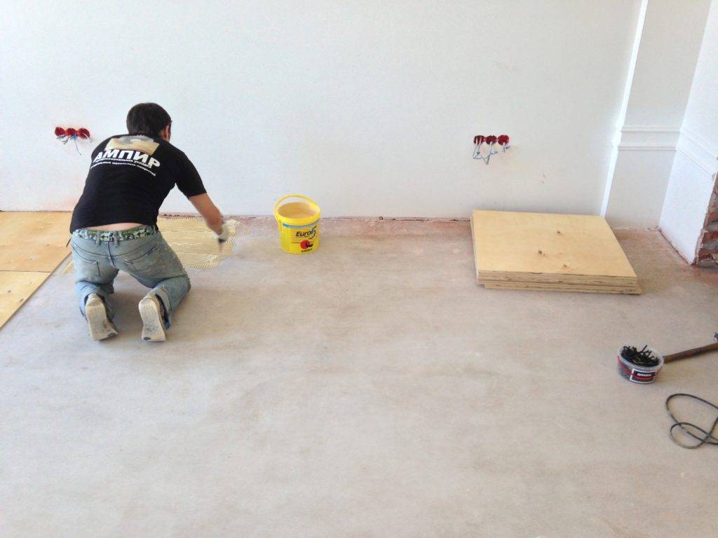- дав поверхности окончательно закрепиться и, возможно, частично осесть, можно приступать к грунтованию и подготовке к укладке основного напольного покрытия.