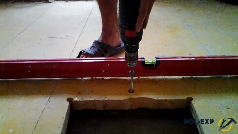 Шаг 5. Вставьте в отверстие большой саморез и вкручивайте его до упора о бетонное основание пола. Как только конец уперся о бетон, немного выкрутите саморез и опять вкрутите его. После каждого повторного вкручивания лага будет немного приподниматься, а пол выравниваться.