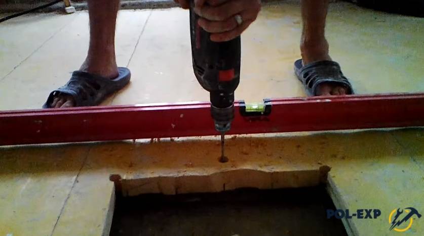 Шаг 2. Сверлом диаметром примерно 5 мм просверлите сквозное отверстие в досках и лаге до упора в бетонное основание. Замерьте расстояние от верхней поверхности половых досок до бетонного основания. Отдельно узнайте толщину досок и лаг. Сделать это можно после внимательного осмотра отверстия.