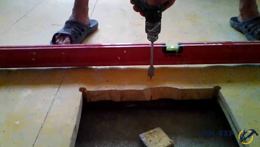 Шаг 4. Просверлите пером отверстие в половой доске. Оно должно располагаться строго посредине лаги.