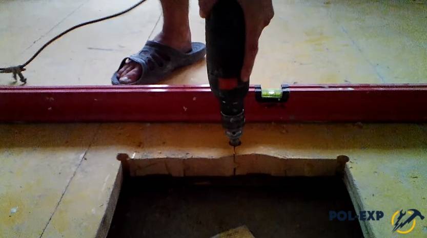 Постоянно следите за положением досок при помощи уровня. Расстояние между саморезами на лаге, в зависимости от предполагаемых нагрузок на пол, в пределах 50–60 см. После выравнивания отверстия заделываются и шлифуются. Такой метод выравнивания пригоден также и для подготовки основания под ламинат или гибкие финишные половые покрытия.