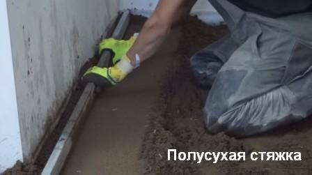 Полусухая стяжка. Ее основная особенность, если сравнивать с мокрой заключается в незначительном количестве воды и наличии легких наполнителей, к примеру, фиброволокна. Нанесение готового раствора осуществляется сплошным слоем на основании, а затем производится его выравнивание и утрамбовка. Застывание полусухой стяжки происходит вдвое быстрее, чем мокрой, что в результате занимает около 2 недель. Такое выравнивающее покрытие имеет оптимальную степень жесткости, стойко переносит механические нагрузки и воздействие влаги.