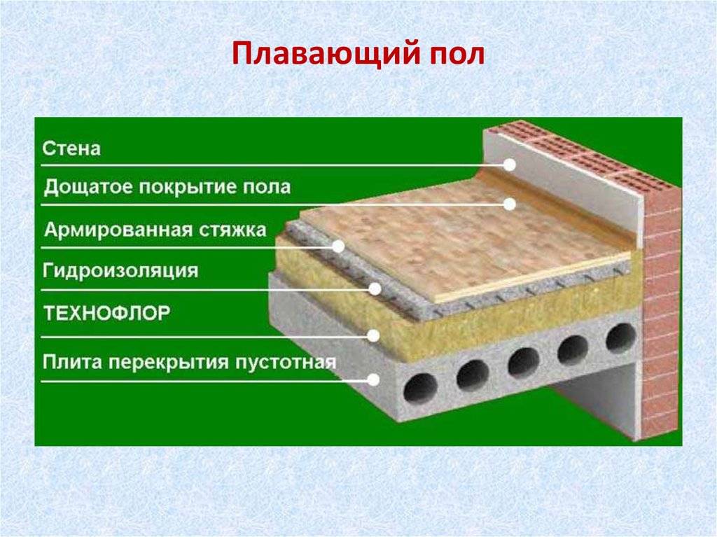 - «Плавающий пол» звукоизоляционный слой кладут между стяжкой и ламинатом. Это один из способов выравнивания пола. Технология установки шумоизоляции проста, но далеко не все материалы хорошо могут изолировать квартиру от внешнего шума.