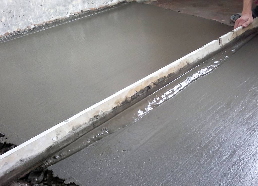 После того, как маяки схватятся, можно приступать к набрасыванию цементной смеси на пол с последующим разравниванием с помощью правила.Для этого следует заранее приобрести готовую выравнивающую цементную смесь и развести ее в емкости подходящего размера с помощью строительного миксера или с использованием специальной насадки на электродрель.