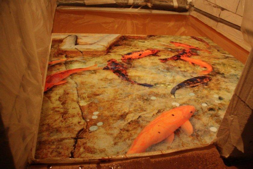 Самый главный этап – нанесение картинки. Если она будет приклеиваться, то картинку необходимо подбирать немного меньше, чем площадь пола. Если будет настоящий рисунок, тогда лучше обратиться к профессионалам. Изображение покрывают лаком.